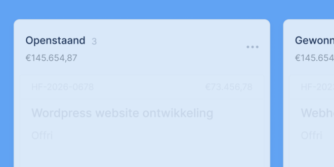Op elk kaartje wordt voortaan ook het offertetotaal getoond, zodat je niet alleen je pijplijn maar ook de waarde daarvan meteen in beeld hebt. In de kanban-view zie je voor iedere kolom ook de totalen van de offertes in die kolom.